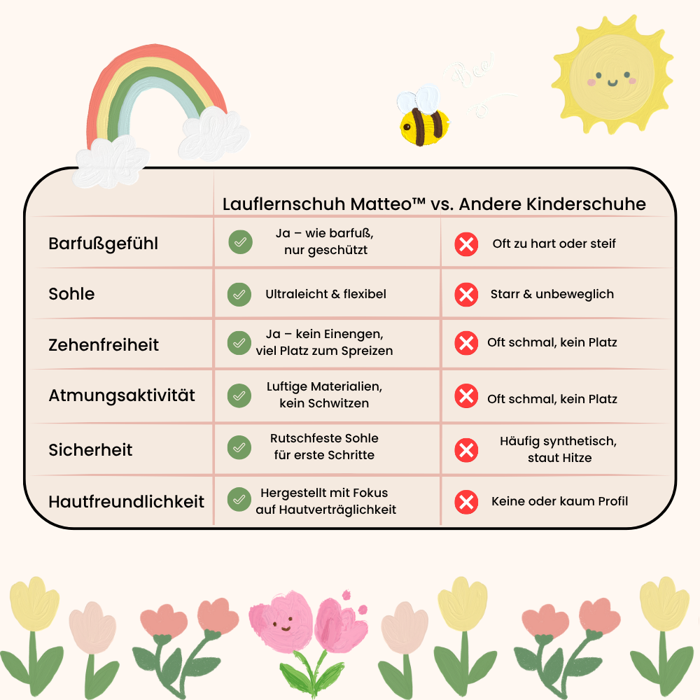 Unser Lauflernschuh Matteo™ begleitet dein Kind beim Laufenlernen – mit allem, was herkömmliche Schuhe oft vergessen.