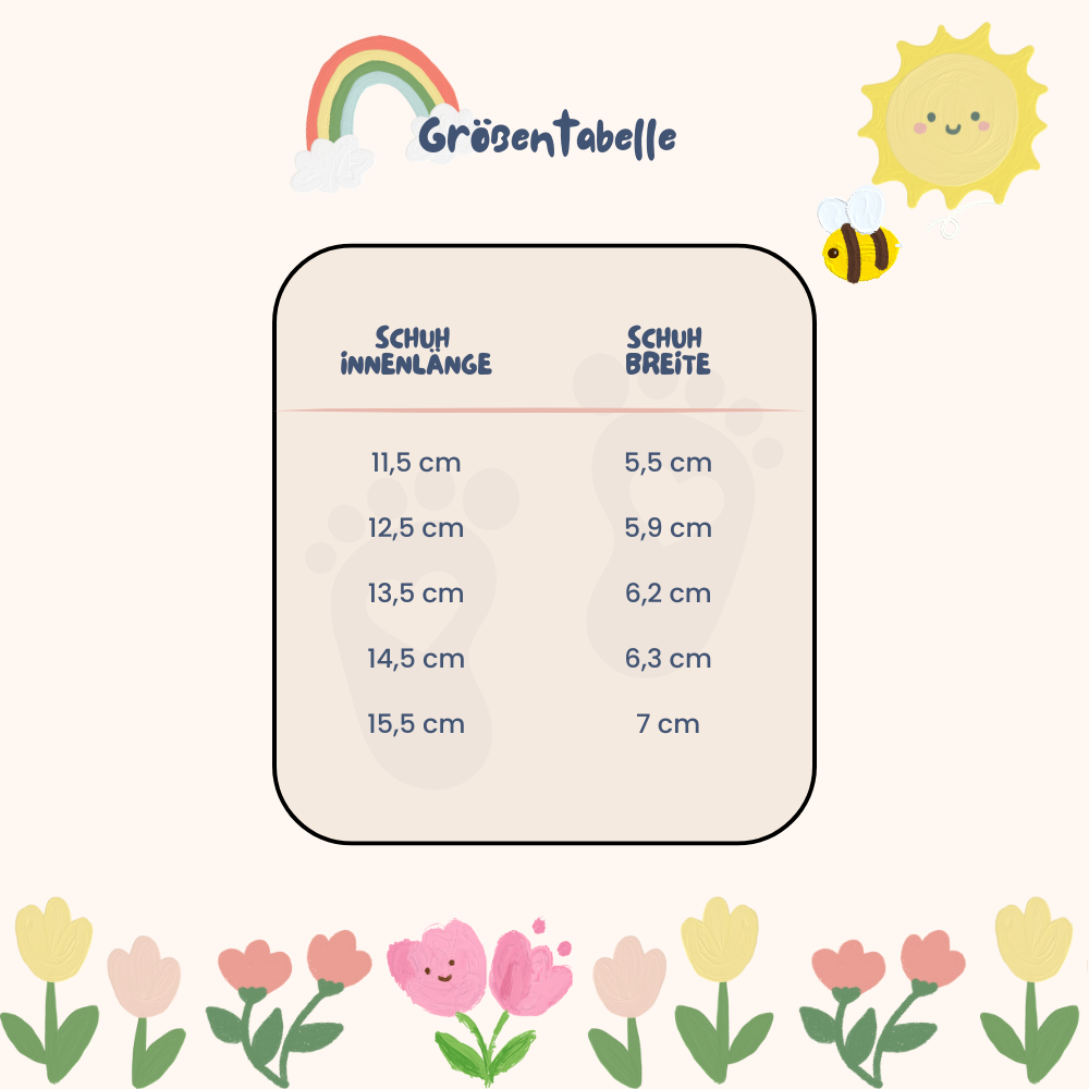 Miss den Fuß deines Kindes am besten am Nachmittag (da sind Füße meist etwas größer) und rechne ca. 0,5 cm bis 1 cm Spielraum dazu – so findet ihr die passende Größe.